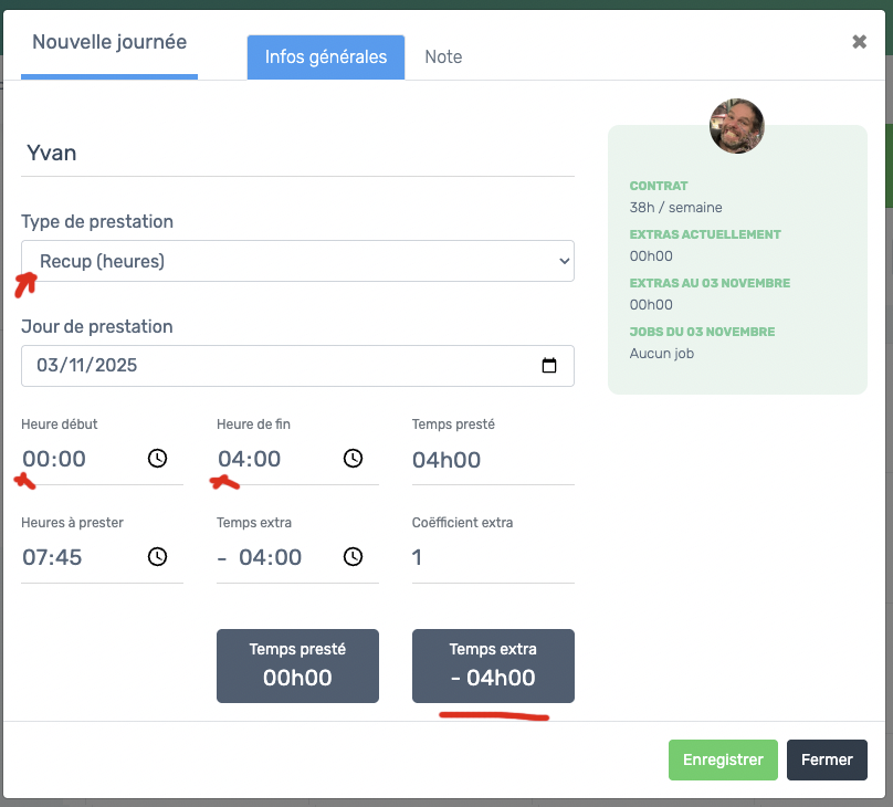 Cette prestation "Recup (heures)" peu être encodée sur le même jour que toutes autres prestations.